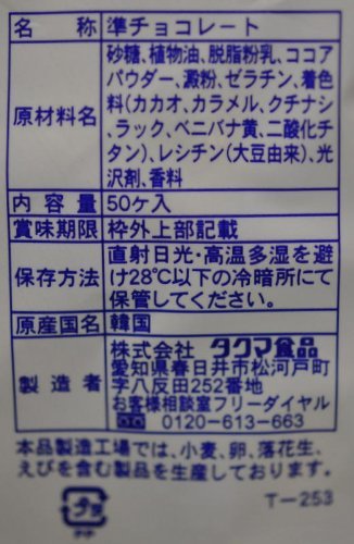 原材料:砂糖、植物油、ホエイパウダー、ココアパウダー、乳糖、水飴、澱粉、ゼラチン、食塩、乳化剤(大豆由来)、着色料(カラメル、クチナシ、ラック、フラボノイド、ベニコウジ)、卵殻Ca、香料、安定剤(アラビアガム)、光沢剤