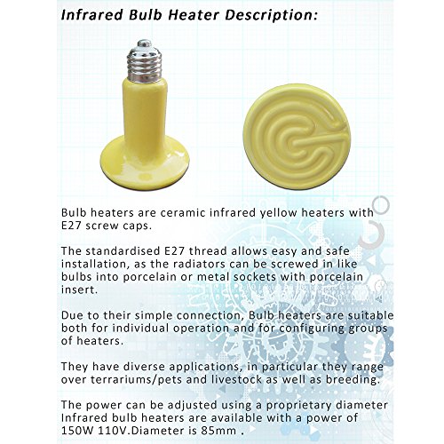 The power can be adjusted using a proprietary diameter Infrared bulb heaters are available with a power of 150W 110V. Diameter is 80mm.