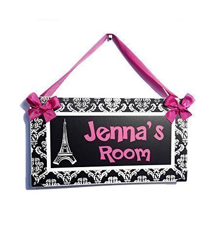 -. Title : Personalized Eiffel Tower Paris Themed Teenagers Bedroom Door Plaque, Hot Pink with White Damask Pattern