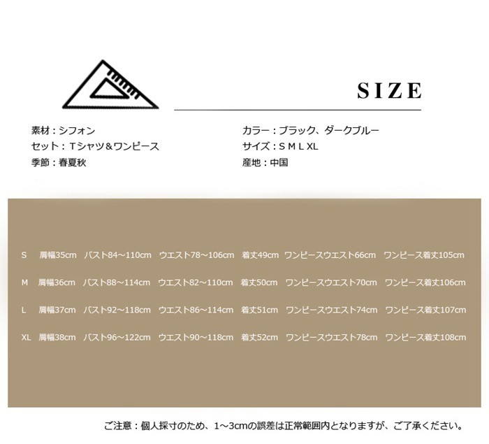 セットアップ レディース 上下セット Tシャツ ワンピース 2点セット 大きいサイズ オールインワン 無地 韓国ファション おしゃれ 2018春夏新作 セットアップ レディース Tシャツ ワンピース 大きいサイズ商品詳細素材:シフォンセット:Tシャツ&ワンピース季節:春夏秋カラー:ブラック、ダークブルーサイズ:S M L XL産地:中国サイズ参照表S 肩幅35cm バスト84~110cm ウエスト78~106cm 着丈49cm ワンピースウエスト66cm ワンピース着丈105cm M 肩幅36cm バスト88~114cm ウエスト82~110cm 着丈50cm ワンピースウエスト70cm ワンピース着丈106cmL 肩幅37cm バスト92~118cm ウエスト86~114cm 着丈51cm ワンピースウエスト74cm ワンピース着丈107cmXL 肩幅38cm バスト96~122cm ウエスト90~118cm 着丈52cm ワンピースウエスト78cm ワンピース着丈108cmご注意:個人採寸のため、1~3cmの誤差は正常範囲内となりますが、ご了承ください。セットアップ レディース 上下セット Tシャツ ワンピース 2点セット 大きいサイズ ルームウェア 花柄 韓国ファション おしゃれ 2018春夏新作 セットアップ レディース Tシャツ ワンピース 大きいサイズ