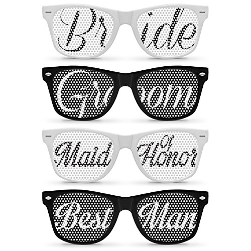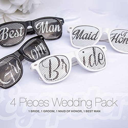 Product Description Put a fun twist on your wedding with our unique wedding sunglasses pack. This classic Retro frame looks good on basically everyone! PACK INCLUDES: ? 1 BRIDE White Sunglasses ? 1 GROOM Black Sunglasses ? 1 MAID OF HONOR White Sunglasses ? 1 BEST MAN Black Sunglasses FEATURES ? See-through lens design (minor impact on visibility). ? 100% UV protection clear lens (polycarbonate). ? Waterproof and scratch resistant lens print. ? Unisex adult size (fits 12 years old and up). PROCESSING TIME: ? Production: 1 to 3 business days ? Your items will be shipped with USPS First Class Mail that takes 2 to 5 days for delivery, for faster shipping please contact us before ordering. ? Orders placed after 3 PM will be processed the next day. 0