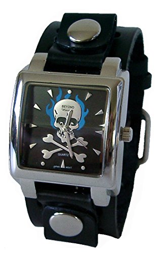 Beyond Women's Square Blue Flaming Skull Watch - Black Leather Cuff Band