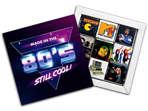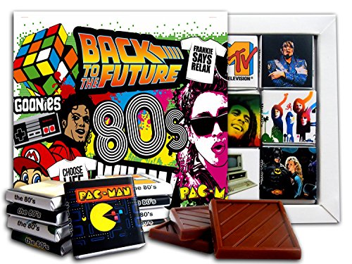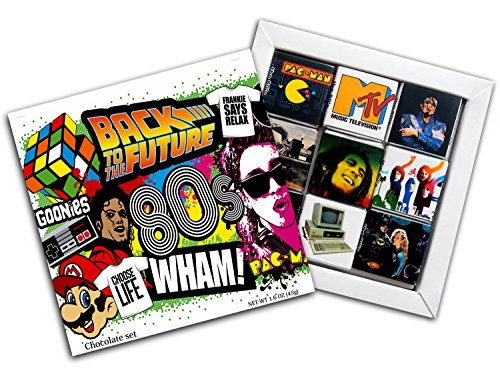 -. Feature : Pieces of chocolate made from high-quality raw. / Gift set has a MAGNET on it's backside so you can hang it on your fridge. / Each of the 9 wrappers contains one of the most important events and things of the 80s / Super Mario Bros., DeLorean DMC-12, MTV, Michael Jackson / Batman, IBM Personal Computer, Queen, ABBA, Bob Marley