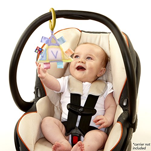 Soft polyester fleece triangle with squeaker; 6 long tags, different colors (ABC's) & textures; Interactive, sensory toy for babies: touch & sound