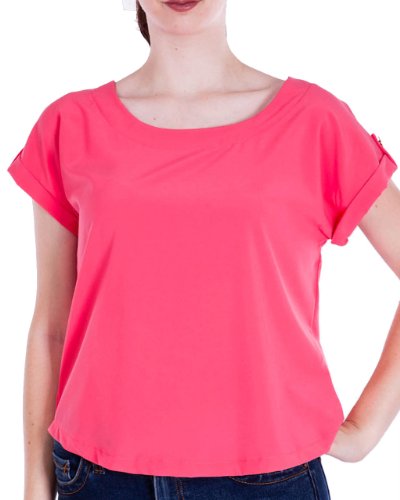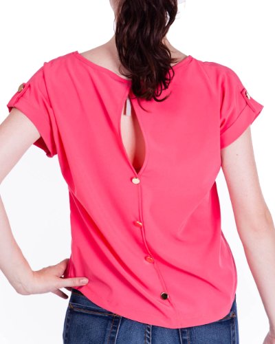 Binding : Apparel Product Description Pink Ladies Short Sleeve Button Back Top. This top features an exposed oval opening at the back, cuffed button tabs on the sleeves, and a decorated four-button back, Colors available in Blue, Pink, and White. , 96% Polyester, 4% Spandex. 0