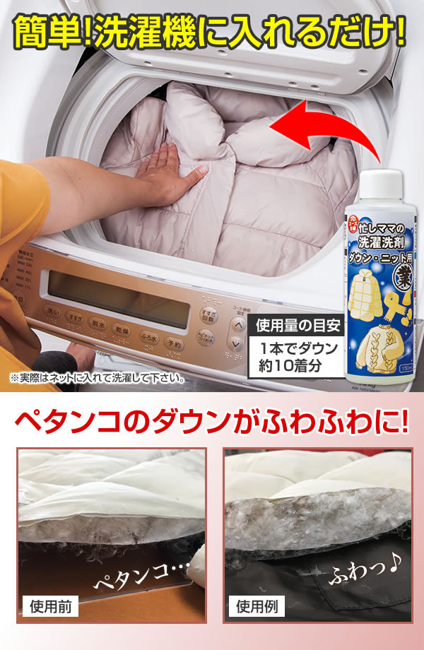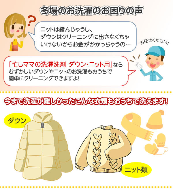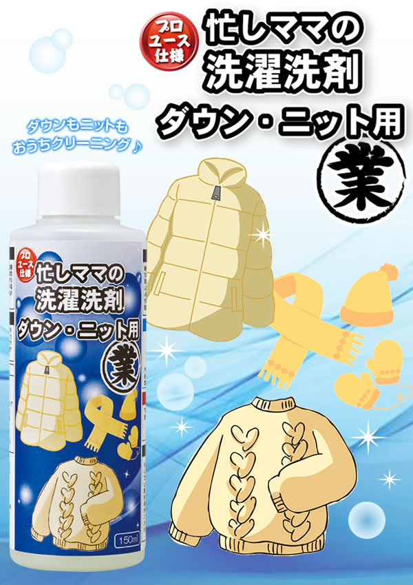 | 「忙しママの洗濯洗剤ダウン・ニット用」はダウンやダウンを使用したウエアやギアの汚れをしっかりと落とすことができる洗濯洗剤です。羽毛に必要な油分を残したまま洗えるので、ダウンにしみこんだ皮脂や汗、表生地の汚れまでパワフルな洗浄力で除去。かさ高さを回復させることで本来のダウンに。 |