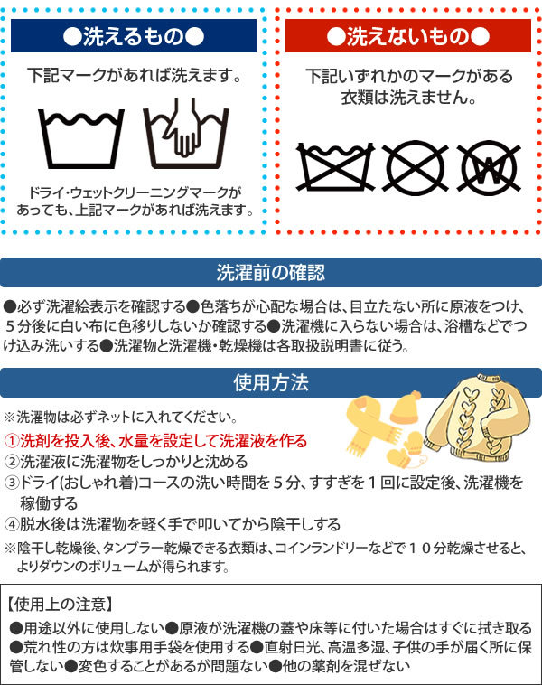 | 「忙しママの洗濯洗剤ダウン・ニット用」はダウンやダウンを使用したウエアやギアの汚れをしっかりと落とすことができる洗濯洗剤です。羽毛に必要な油分を残したまま洗えるので、ダウンにしみこんだ皮脂や汗、表生地の汚れまでパワフルな洗浄力で除去。かさ高さを回復させることで本来のダウンに。洗濯用洗剤/柔軟剤/液体洗剤/おしゃれ着洗い/すすぎ1回/クリーニング/洗濯機/ドライクリーニング/自宅/汗抜き/臭い/解消/ドライマーク/黄ばみ/皮脂汚れ/ふわふわ/ぺたんこ/ウェアアクセサリー/洗剤/アウトドアウェア/ダウン/メンテナンス/クリーナー/ダウンジャケット/ |