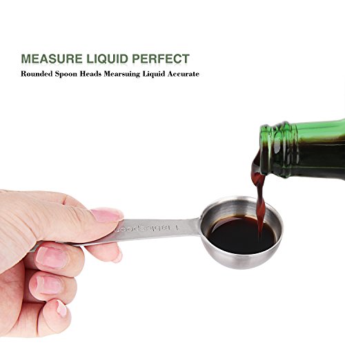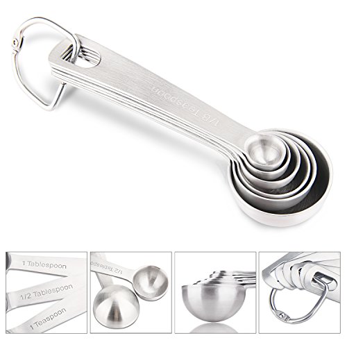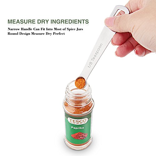 - Feature : ★ ELEGANT & UNIQUE DESIGN. PROFESSIONAL-QUALITY STAINLESS STEEL.COMPLETELY SOLID.FDA Approved Food Grade Stainless Steel.Every part of measuring spoon heavy duty construction is solid and strudy. Unique D-shape ring which helps to keep the spoons together after a full day of baking or cooking. Innovative cupped and rounded spoon heads with narrow handle allows reaching into spice jars and other small containers without spilling out. / ★ RIGHT ACCURATE MEASURE FOR RECIPES. 6 convenient sizes engraved markings easy to read standard and metric measurements. / ★ USEFUL FOR A VARIETY OF KITCHEN MEASURING TASKS Contains 6 spoons: 1/8-tsp, 1/4-tsp, 1/2-tsp, 1-tsp, 1/2-Tbsp and 1-Tbsp.1 tablespoon (15 ml), 1/2 tbsp (7.5 ml), 1 teaspoon (5 ml), 1/2 tsp (2.5 ml), 1/4 tsp (1.25 ml) and 1/8 tsp (0.6 ml). Making measuring out dry and liquid ingredients easy. Bake with confidence with these measuring spoons designed specifically for home bakers. / ★ WELL MADE AND COMFORTABLE. EASY TO CLEAN AND DISHWASHER SAFE.GREAT GIFT. Safe to use in the dishwasher. / ★ PRODUCT WARRANTY & SATISFACTION GUARANTEE We offer a 1-year-warranty plus lifetime warranty to make you happy and satisfied with our product,If you're not happy with your purchase, just send them back for a no-questions asked, hassle-free refund.