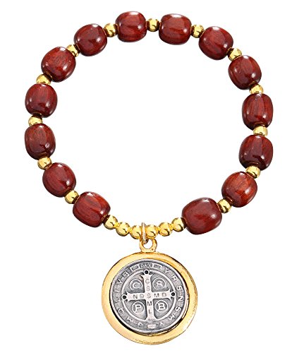 -. Feature : 8mm Cherry Wood Beads / 1 inch long St Benedict Oxidized Two Tones Color Medal / Stretchable / Made in Brazil / A great gift for everyone of all ages