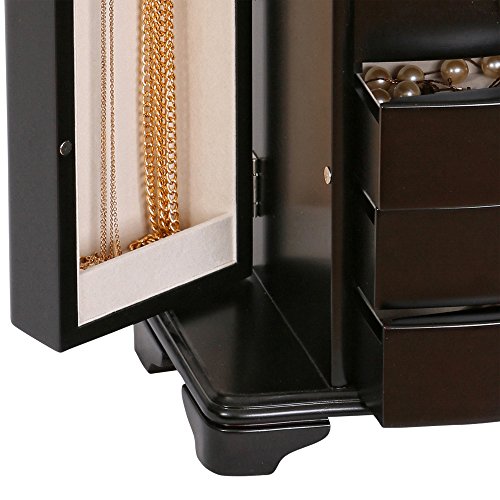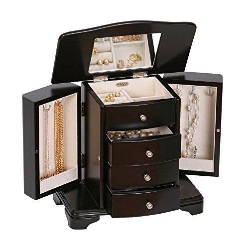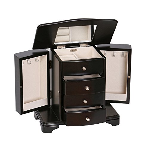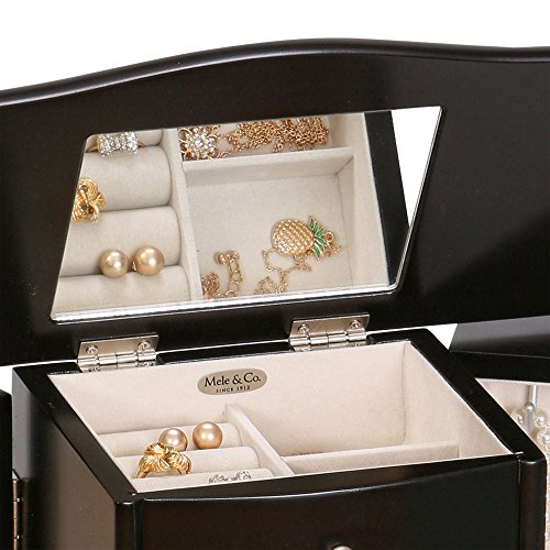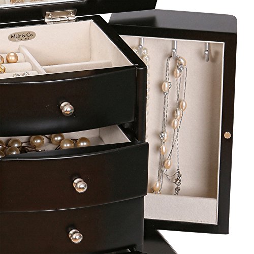 -. Binding : Jewelry -. Brand : Mele & Co. -. Color : Black -. Department : women -. EAN : 0739175894748 -. Feature : RICH JAVA FINISH. Silken finish invites closer inspection. / DUAL NECKLACE DOORS. Doors house 3 hooks each with catch panels. / 3 OPEN AREA DRAWERS. Open area storage gives you freedom to arrange your jewelry as you please. / IVORY SUEDED INTERIOR. Hand lined interior protects your jewelry from scratches and abrasions. / FOOTED PLATFORM BASE. Furniture quality details. -. IsAutographed : 0 -. Label : Mele & Co. -. Manufacturer : Mele & Co. -. Model : 00746S16 -. MPN : 00746S16 -. PackageQuantity : 1 -. PartNumber : 00746S16 -. ProductGroup : Home -. ProductTypeName : FASHIONOTHER -. Publisher : Mele & Co. -. Size : 10 x 5.5 x 9 -. Studio : Mele & Co. -. Title : Mele & Co. Dane Wooden Jewelry Box (Java Finish) -. UPC : 739175894748