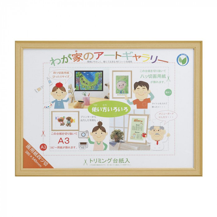 前面には環境にやさしく、軽くて丈夫なPETシートを使用。台紙にあるガイド線に沿って切り抜くとA3コピー用紙が飾れます。 |