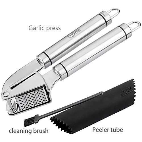 - VITAL KITCHEN ACCESSORIES : Along with the multipurpose garlic crusher, you'll also receive an easy-to-use silicone clove peeler tube and cleaning brush, These gadget will keep the chopper all clean and ready to go when it's time to dig deeper into the cookbook or grandma's recipes