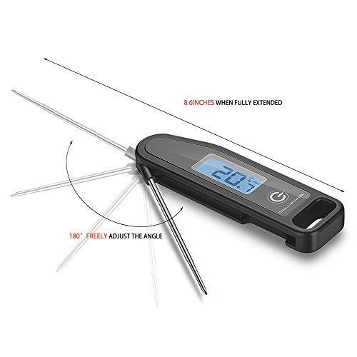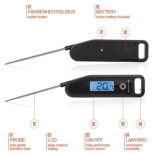- Convenient: Build-in hold function, this candy thermometer can automatically hold the temperature reading until the ONLY button is pressed again. Choose Fahrenheit or Celsius on the back of the meat thermometer. This thermometer is splash-proof, easy to use, and easy to clean.