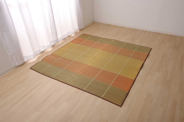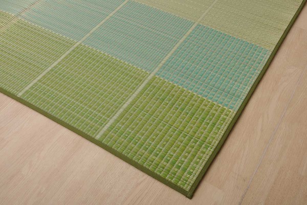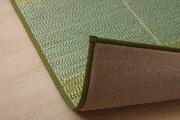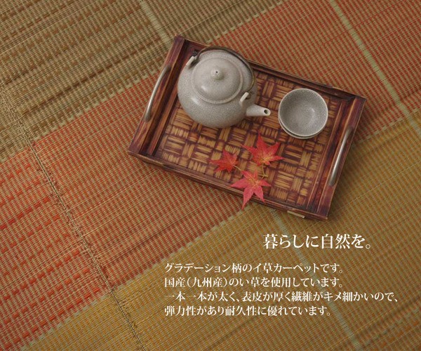 グラデーション柄のイ草カーペットです。国産(九州産)のい草を使用しています。一本一本が太く、表皮が厚く繊維がキメ細かいので弾力性があり、耐久性に優れています。い草には空気の自然浄化作用、湿度の調節作用などがあります。また汚れにくく、使用するうちに黄金色に変化し味が出ます。い草に青森ヒバ加工を施しています(抗菌、防臭効果)。青森県のヒバの木から抽出した「ヒバ油」をメーカー独自の技術で商品に加工しました。「ヒバ油」には、ヒノキチオールという天然物質としては極めて抗菌性の高い成分が含まれ、医療や食品など他分野で利用研究が進められています。裏にはウレタンを貼っていますので適度なクッション性があり、フローリングでのご使用にも適しています。