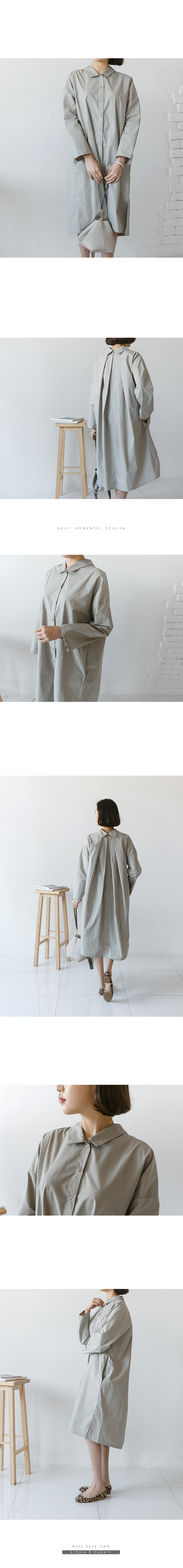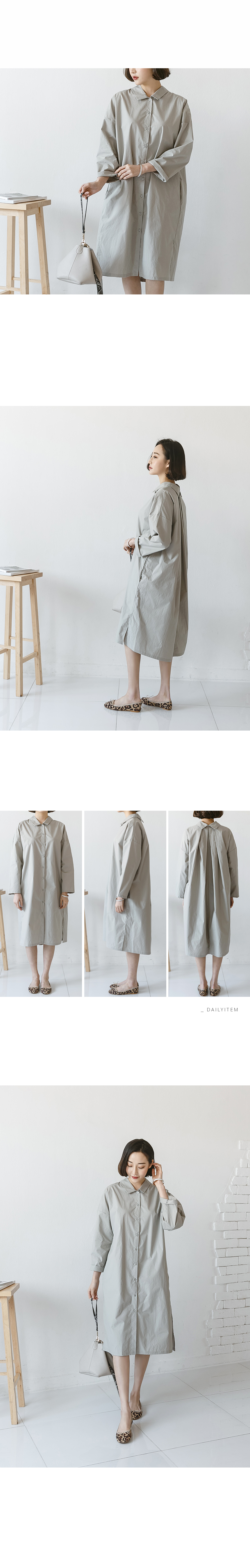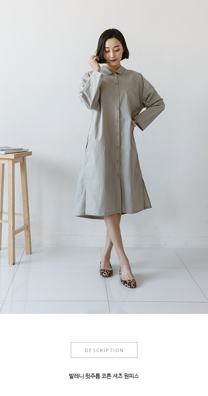 전체적으로 둥근 라인의 오버핏 셔츠 원피스로 뒷부분으로 넘어가는 핏과 뒷목선 아래로 잡은 주름으로 독특한 라인이 잡히는 디테일이 멋스러운 원피스예요