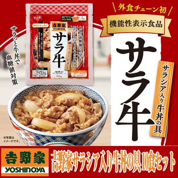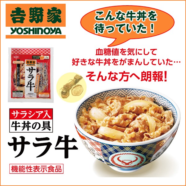 CMで話題!牛丼の吉野家発!血糖値の上昇をゆるやかにする機能性表示食品 サラシア入り牛丼の具をご自宅で堪能!大反響!こんな牛丼を待っていた!・・・もう大好きな牛丼を我慢しなくていいんです!!もう我慢しなくてもいいです!食後の血糖値を気にして大好きな吉野家の牛丼を我慢していた方・・・これならもう大丈夫!外食チェーン初の機能性表示食品。食後の血糖値の上昇をおだやかにするサラシア配合。 ・・・こんな牛丼を待っていたんです!血糖値を気にして好きな牛丼を我慢していた・・・そんな方にぜひお召し上がりいただきたい!!店で食べる“牛丼のうまさ”はそのままに、「サラ牛」をどうぞお試しください。 ■冷凍