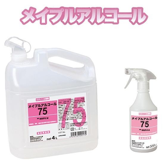 メイプルラビングAが、更に除菌力を高めメイプルアルコールに生まれ変わりました。エチルアルコールは除菌作用があり、細菌・カビ・酵母の繁殖防止に効果があります。アルコール製剤に使用されているエチルアルコールはビール、日本酒、焼酎などのアルコールです。原料はイモ、トウモロコシ、米などの自然食品由来のアルコールであり、食品や食器に振りかけても何ら問題ありません。 |