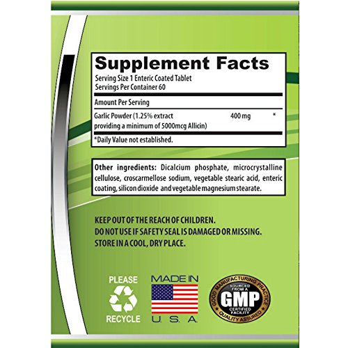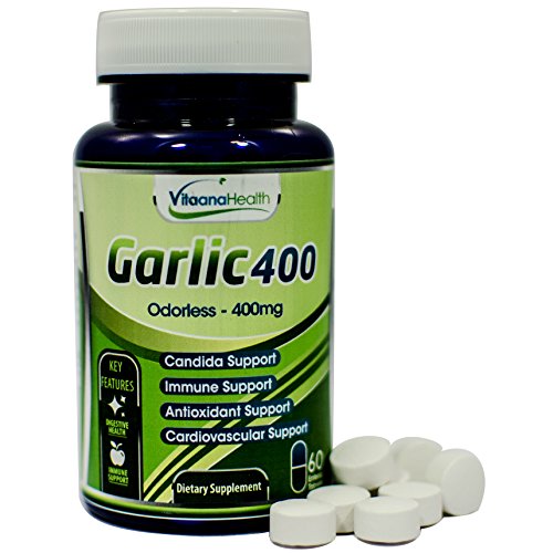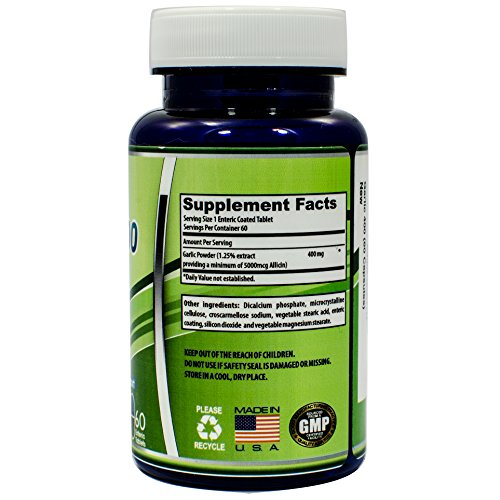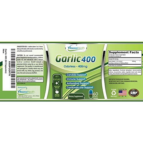 - Feature : HEART HEATLH: Garlic can help maintain cardiovascular health, support healthy cholesterol levels that are already within normal range as well as support circulation and blood pressure / IMMUNE SUPPORT & DIGESTIVE BALANCE: Supports internal cleansing and can help manage yeast or Candida imbalance. Supports immune system to help strengthen the body's natural defences / ODORLESS AND BIO-AVAILABLE: Delivers all the benefits of fesh garlic without bad breath or body odor. Enteric coating ensures tablets survive stomach acid and dissolve in the intestine for maximum bioavailablilty / POTENT YET WELL TOLERATED: Each tablet delivers a minimum of 5000mcg of Allicin, the active ingredient, and equivalent to the level of Allicin delivered by 2 crushed cloves of garlic / QUALITY ASSURANCE: Our supplements are manufactured in the USA in FDA and cGMP compliant facilities. If for any reason you are not completely satisfied with Garlic400, simply return the bottle to Amazon within 30 days for a full refund, even if the bottle is empty