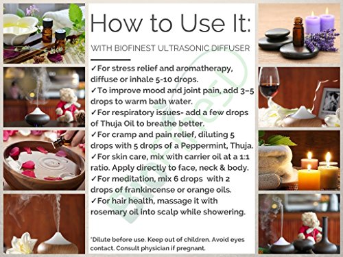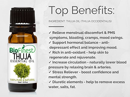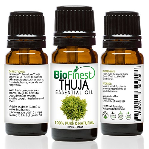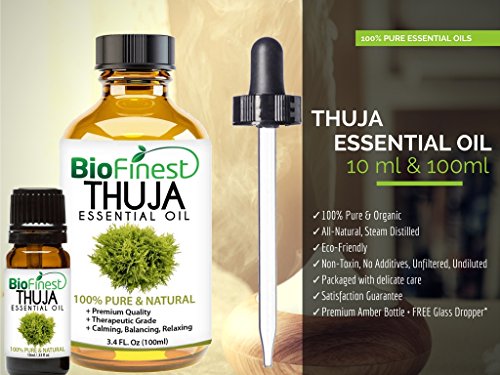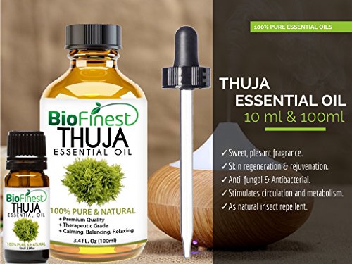 -. Feature : PREMIUM QUALITY THUJA OIL: 100% Pure, Non-Toxic, No Additives, Unfiltered and Undiluted with No Fillers. Vegan certified, organic, paraben free and cruelty free. Safe for family and home use. / FREE E-BOOK QUICK START GUIDE (worth $37): Exclusive access to Biofinest comprehensive essential oil guide "100 Ways To Use Essential Oil". Printable and beginner friendly. Make blends with your favourite essential oils, and enjoy home aromatherapy today! / IDEAL FOR HOME & FAMILY: Aromatherapy, Gift, Custom Massage and Body Oils, Vaporizers, Diffusers, Oil Burners, Humidifiers Inhalation, Perfume, Blends, Spa and Home Care, Cleaning Products, allergen-free alternative to candles or incense Uses. / 100% BEST VALUE FOR YOUR MONEY: Comes with premium euro dropper cap for easy dispensing. Packaged in USA with Sealed Amber Bottle. No Leakage or Dripping. We are eco-friendly USA company who stand behind our brand. Try our products risk-free with 100% money back guarantee. / 100+ BESTSELLERS: Basil, Bergamot, Cinnamon, Citronella, Clary Sage, Clove Leaf, Coriander, Cypress, Eucalyptus, Frankincense, Geranium, Ginger, Green Tea, Jasmine, Juniper Berry, Lavender, Lemon, Lemongrass, Lily Flower, Mandarin, Marjoram, Myrrh, Neroli, Orange, Oregano, Patchouli, Peppermint, Pine, Roman Chamomile, Rosemary, Sandalwood, Spearmint, Tea Tree, Thyme, Vetiver, Wintergreen, Ylang Ylang, Aloe Vera, Argan, Coconut, Evening Primrose, Flaxseed, Grapeseed, Jojoba, Pomegranate seed