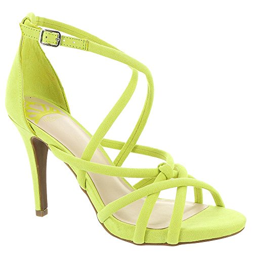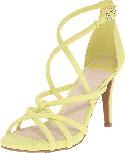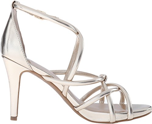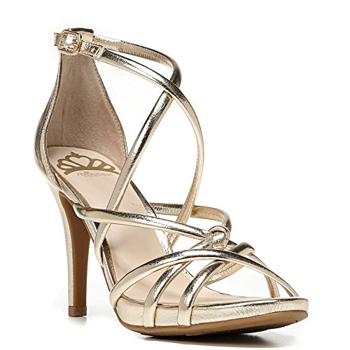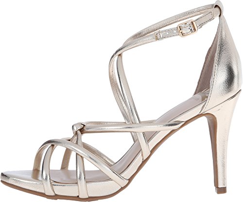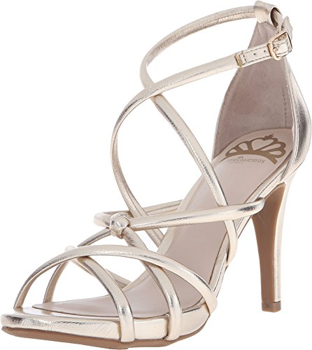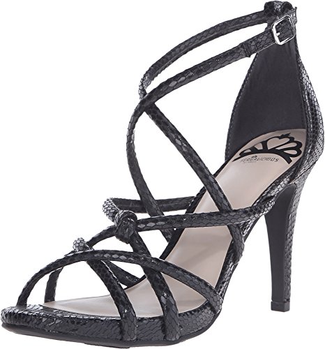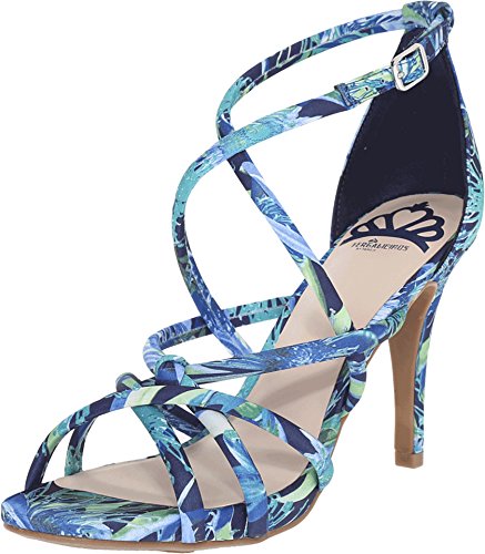 Faux leather, fabric upper featuring a variety of textures and looks. Open toe design. Wrapped heel. Buckle at the ankle. Synthetic insole and lining. Imported.