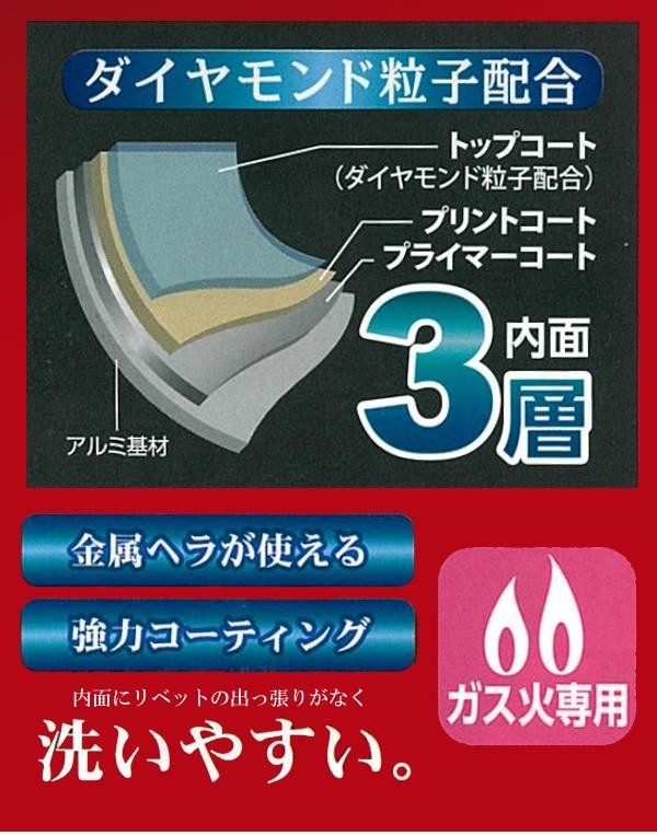 丈夫・軽量・キズに強い!金属ヘラが使えます。内面にリベットの出っ張りがないので洗いやすく、お手入れもラクラクです。 |