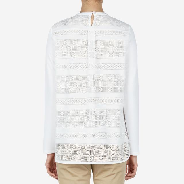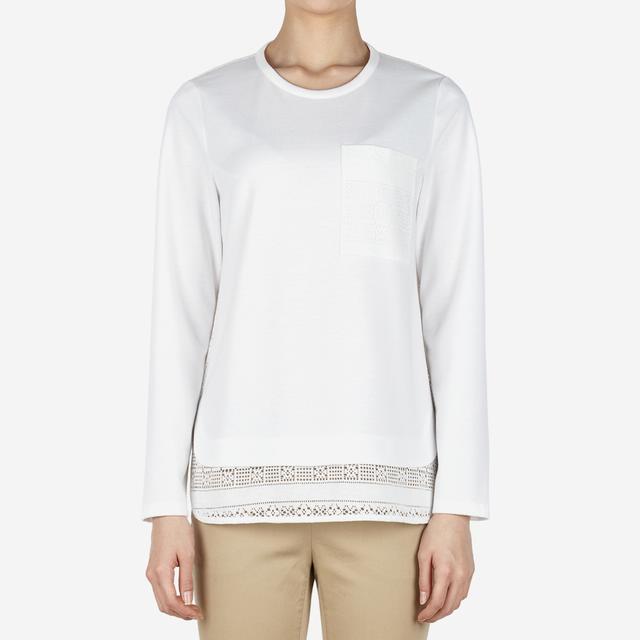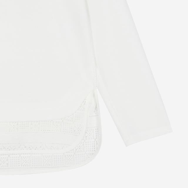 섬세한 짜임의 레이스 니트를 배색하여 여성스러운 느낌을 살린 블라우스입니다.