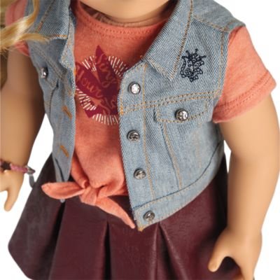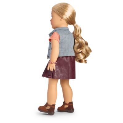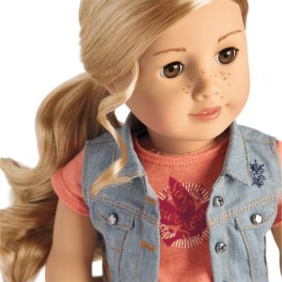 The 18" Tenney doll has light brown eyes that open and close, freckles on her nose, and long, curly blond hair. Tenney's unique hand positioning helps her hold her guitar, banjo, and pick! She arrives in a graphic tee, denim vest, faux-leather skirt, and ankle boots. Also included are a woven bracelet and the Tenney paperback book.Feature