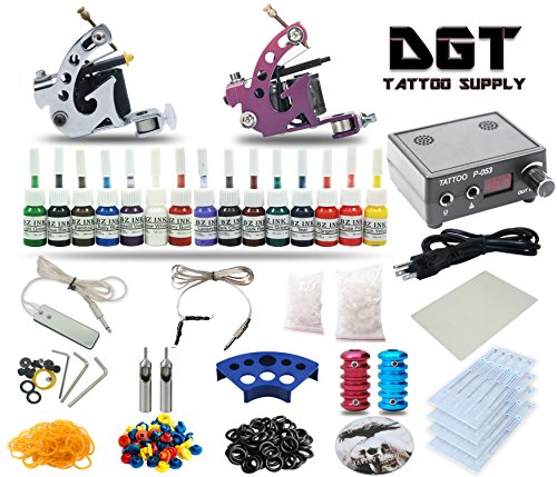 Studio : DGT Tattoo Supply Publisher : DGT Tattoo Supply Binding : Misc. Product Description 2 x Tattoo Machine 1 x Power Supply 1x Stainless steel foot pedal / Clip cord 15 x 5ml Tattoo Ink 1 x Ink Caps Holder 1 x Tattoo Practice Skin 25 x Machine O-Rings 25 x Colored Nipples 25 x Rubber Band 1 x Adjustable Tool Kit with other attachment 1 x Tattoo Tutoring DVD 20 x Sterile Needles 3,5RL / 5,7M1 (5 each) 2 x Tattoo Machine Grips / Barrels 2 x Stainless Steel Tips (3R, 5Mag) 50 x Tattoo Ink cups (Small) 50 x Tattoo Ink cups (Medium) 0