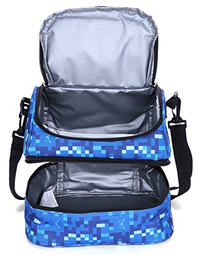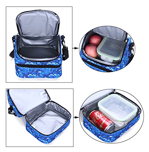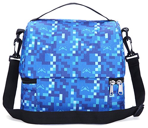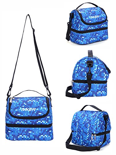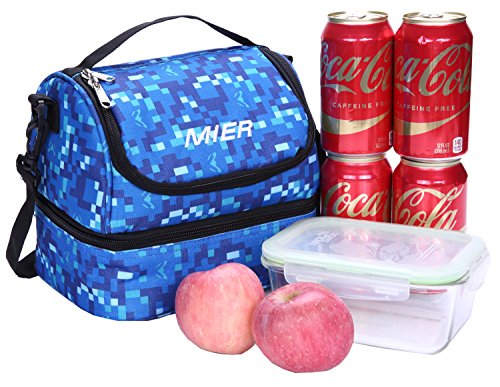 -. Feature : MIER lightweight lunch bag with a top handle strap and a detachable shoulder strap for easily carry, the strap can adjust to 120cm so an adult can wear it crossbody style when you are holding a baby and another bag and a million other things / Lunch box has two sections that keep cold and warm items separate. 2-way dual zipper top, plenty of room for thermos, chips, fruit ,drinks, snacks and cookies. Bottom compartment easily fits a can of soda and a medium sized tupperware to carry your lunch,sandwich,salad / This insulated bag is made of durable, sturdy fabric and food safe, Eco-friendly PEVA lining, easy to clean / Stylish lunch cooler bag for school,work,and everyday use. It is a good gift for your little girl or your girlfriend / The bright and colorful pattern makes it fun to carry around. Manufacturer recommended age: 5+ years