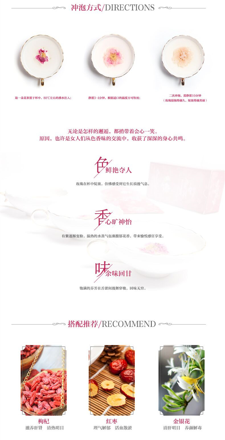 1.玫瑰花茶开封使用后,需将封口及时拉上,避免受潮及氧化