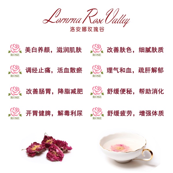 玫瑰花是很好的药食同源的食物,女性平时常用它来泡水喝,有很多好处。可以美容养颜,通经活络,对于心脑血管,高血压,心脏病及妇科有显著疗效。调和肝脾,理气和胃。 加入桂圆,营养丰富,含有各种糖类及维生素,可补心脾,治脾虚泄泻、补气血、安神、治失眠、惊悸。枸杞养肝明目,补血安神,生津止渴,润肺止咳。 长期服用,效果显著。 做法:桂圆干+枸杞用沸水冲泡10分钟,加入洛安娜玫瑰花瓣,再静置5分钟,依据适口的温度方可饮用。 洛安娜玫瑰谷所采用的玫瑰花是他绽放到最美的时光摘下,和普通的苞心不同,没那么硬,含有的玫瑰精油及营养更高