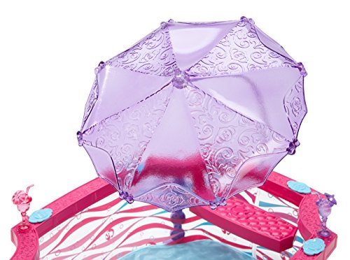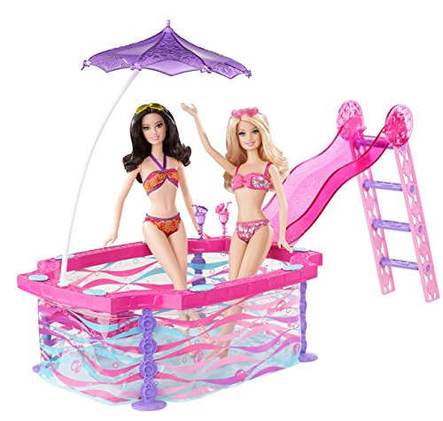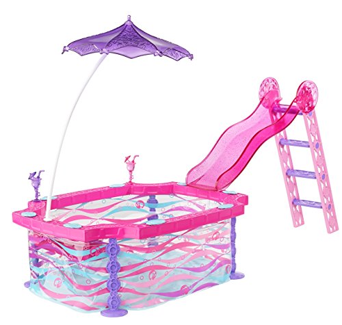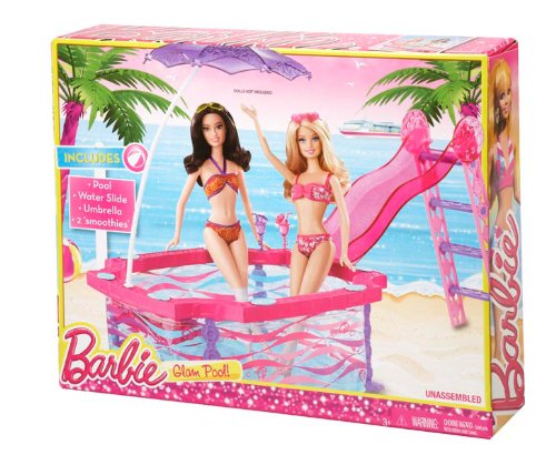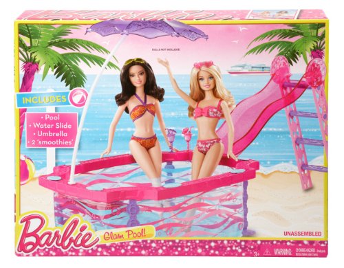 Summer just got a lot sunnier thanks to the Barbie Glam Pool! In bright, swirling colors, it’s the perfect fun-in-the-sun place for Barbie doll and her friends. Simply fill with water and sun-loving dolls (sold separately) for cool fun. The pool comes with a ladder and slide as well as a moveable purple umbrella. Attach the translucent, glittery slide to one side of the pool and the umbrella on the other, or move the umbrella around to create just the right amount of shade. It snaps easily into one of five holes, and with its curved post and pretty alternating design, it’s as much a fashion statement as a sunshade. Entertain with a pool party or get healthy with a dip; ride the slide for a big splash or stay cool in the shade - however the time is spent, the glam pool lets Barbie doll and her friends soak up the glam life! Set also includes two tropical drinks for extra refreshment! Dolls not included. Ages 3 and older.Feature