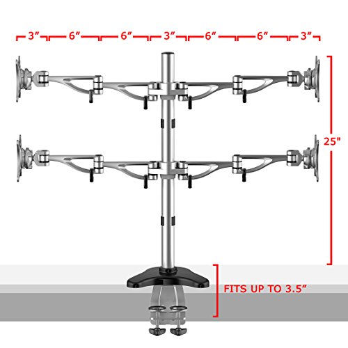 - Feature : Desk-mountable, supports up to four 24-Inch LCD monitors, each is on dual swing arm; pole length: 25.4-Inch (646 mm); available in clamp base. / Clamp table thickness: 0.79-Inch to 3.54-Inch (20-90 mm); Solid Aluminum die-cast construction; easy installation and dis-installation; swift and easy movements and adjustments / Weight Capacity: Supports up to 22 lbs (10 kgs) for each monitor; Tilt: -5 degrees to +15 degrees ; Sw: 360 degrees (portrait or landscape); Swivel: Max 180 degrees ; Maximum Height adjustable: 22.05-Inch (560 mm) / Compatible with the standard VESA mounting patterns: 50 x 50, 75 x 75 and 100 x 100. These are the square bolt patterns behind your monitor and measure approximately 2"x 2", 3"x 3" or 4"x 4". / Space saving with its compact design; Neat and efficient cable management; clean look with minimal hardware visible from underside of work surface; Maximum productivity and supreme ergonomic comfort