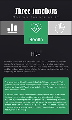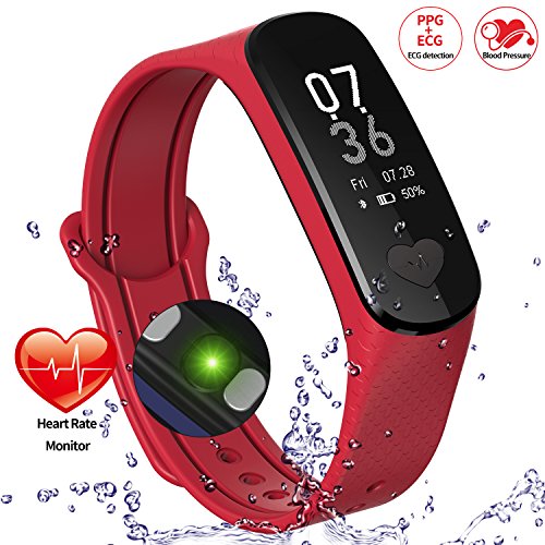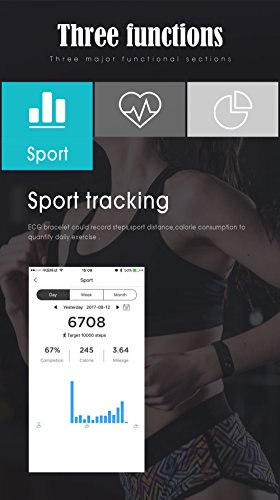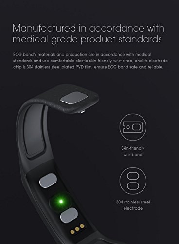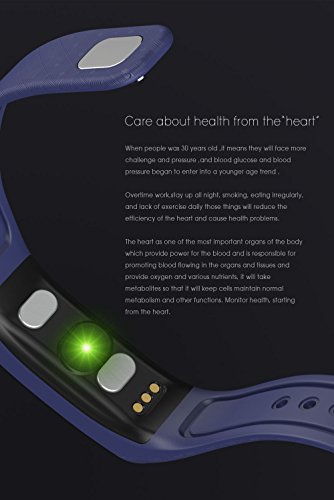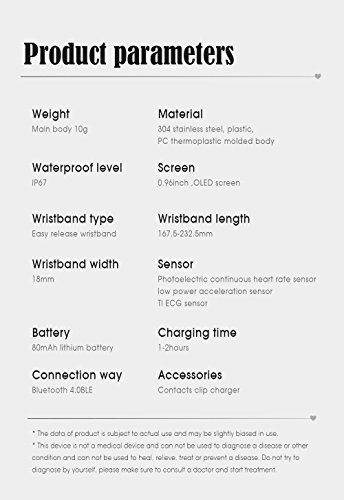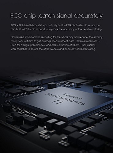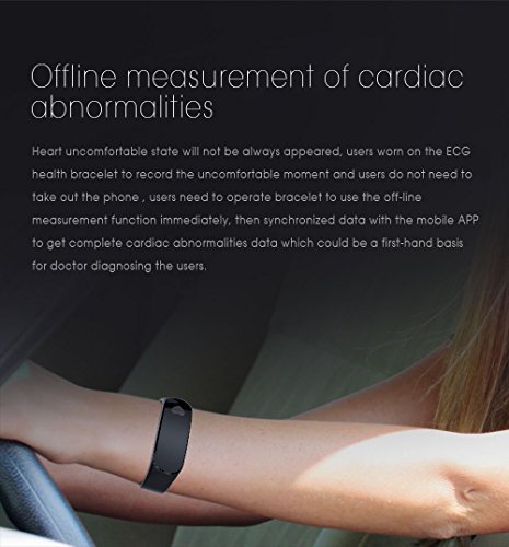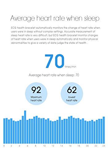 -. Feature : 【ECG Detection】ECG health bracelet automatically monitors the change of heart rate when user were in sleep without complex settings. Accurate measurement of sleep heart rate is very difficult, but ECG health bracelet monitor changes of heart rate when users are in sleep automatically and monitor physical abnormalities to give a variety of data judge the state of health. (NOTE: The data only for reference and can not guarantee 100% correct,don't for medical use,please know.) / 【Shake Snapshot and Wrist Size】Users shake bracelet could take photos without using mobile phone.The fitness watch band size fit for wrist from 5.1'' to 7.4''(130mm-188mm),Wristband width:18mm. (This bracelet is be a best choice for Valentine's Day Gift) / 【Life Waterproof】With IP67 Waterproof Grade,you can wear it in swimming, rain, and water.(Note:Although the waterproof level is IP67,but do not recommend swimming or diving for a very long time wear bracelet,keep under 1 meter water 30minutes.Do not touch warm water or hot water, not long soak in the water.) / 【Wide Compatibility and Services】 Fitness Tracker compatible with iOS and Android system, support buletooth 4.0, for Samsung S3/S4/S5 Note2/Note3/Note4,IOS 8.0 and above,Android 4.4 and above. If You Have Any Questions Before Purchasing OR For Any Reason You Are Not Satisfied, Please Feel Free To Contact Us Via Amazon with Your Order ID or Via" Help Desk" on Amazon Messaging Services for All Your Issues,Experience Our Friendly Support Team for Quick Solutions. / 【Turn On and Fast Charge】First time use,Long press the touch key below the screen to turn on bracelet.If the screen can not be turn on,charge it for 1-2hours,then try to re-start it up.Charge methods--①.Find the charging touch spots at the back of the bracelet;②.Make the pins of clip charger aim at the touch spots and clamp the bracelet tightly,USB and plug into computer USB port to charge.(NOTE:The charger must clampe the bracelet tightly,otherwise you may fail to charge.)