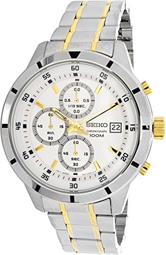 Seiko sports watches complete all of these adjectives and many more! Seiko sports watches especially the line works in all types of conditions and circumstances and embodies the same characteristics as the person who wears one! A watch that holds up under almost any circumstance A Seiko watch leads the way whether youre out on the trail or out on the water The dynamic design of the white watch dial and the equally powerful bezel take on all the elements and are perfectly complemented by the rugged stainless steel case housing which is an amazingly 12mmMM thick! This watch is water-resistant up to 100 meters 330 feet 10 atm and comes complete with an easy to read white face with gold hands The 44mmMM case is offset by a dependable silver stainless-steel watch band will makes sure your watch stays securely attached to your wrist through all kinds of adventures! The stability of the rugged hardlex crystal combined with the reliable quartz movement and all the extra added features such as chronograph and water-resistant should make the Seiko watch one serious contender on your list for Sports Watch of the Year!!! This versatile watch will become just like a reliable partner for all of your busy activities In fact after you get your Seiko watch youll wonder how you got along without it all this time!Feature