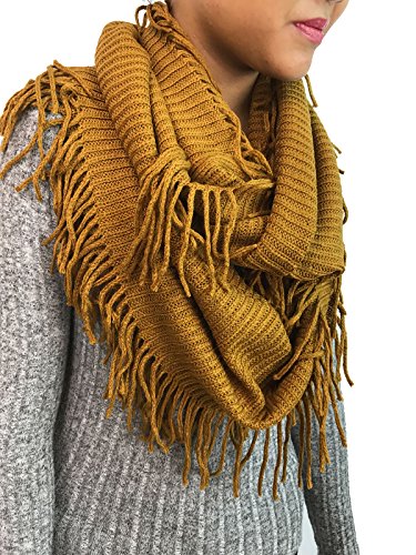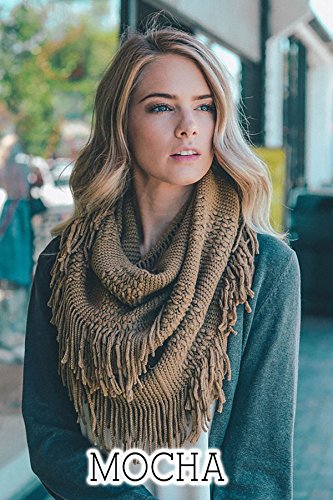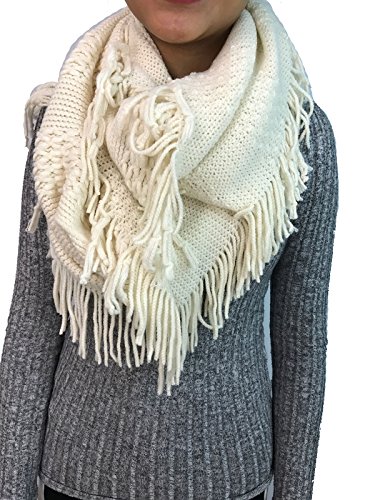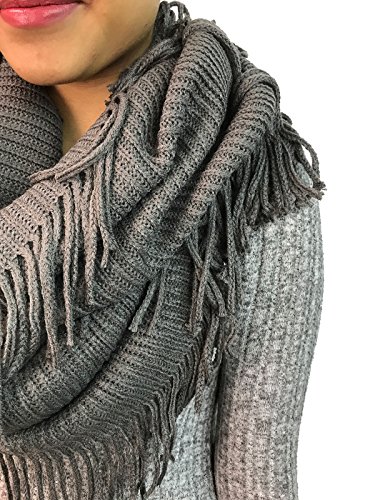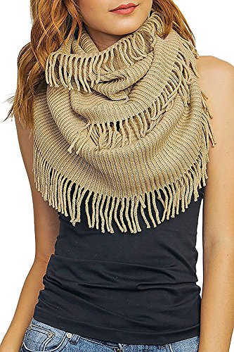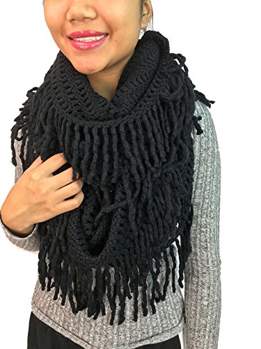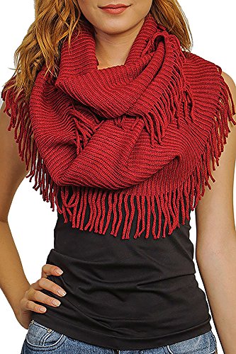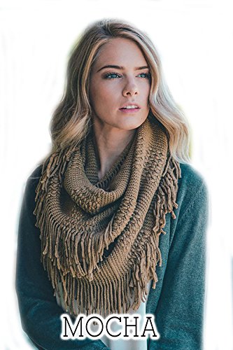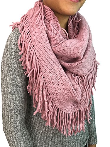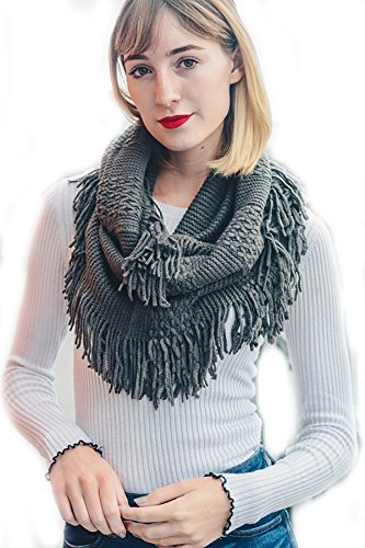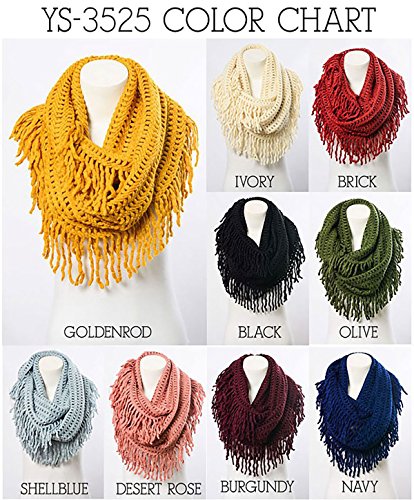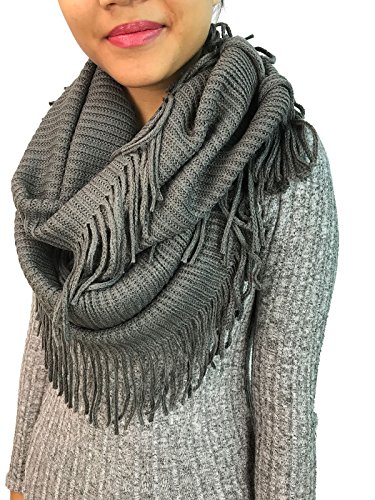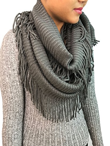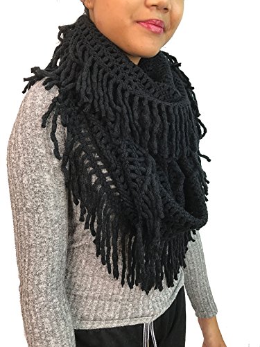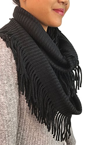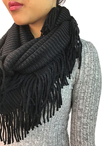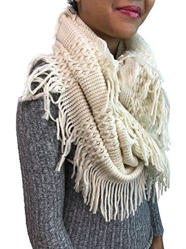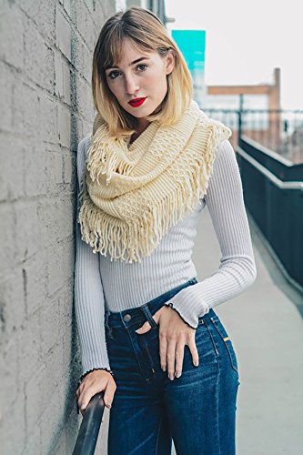 | Women's Winter Knit Ribbed Fringe Pointelle Lattice Tassel Infinity Scarf Cowl Wrap |
