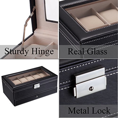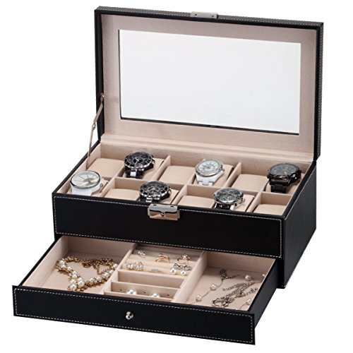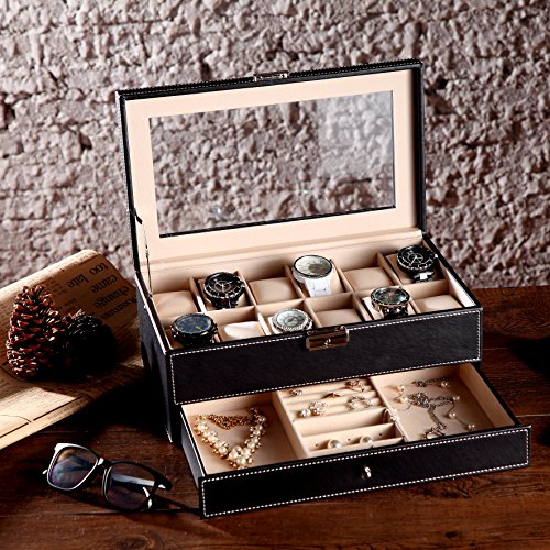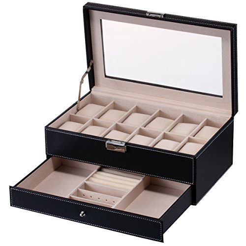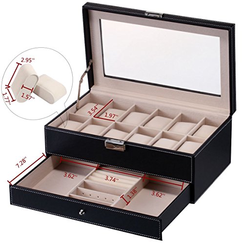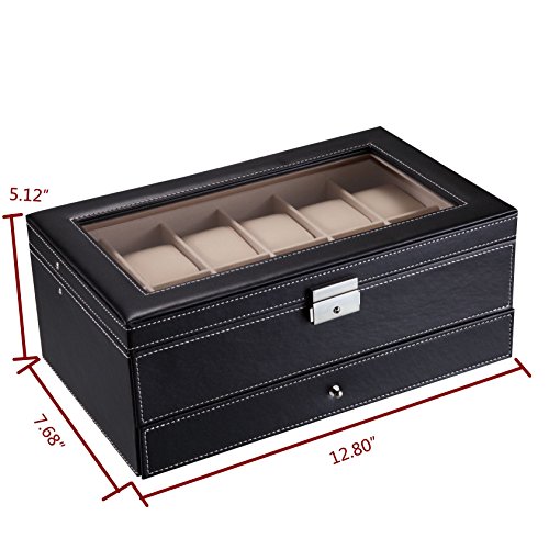 Homde 12 Slots Watch Box PU Leather Watch Organizer with Lockable Glass Top Drawer Jewelry Tray (black)