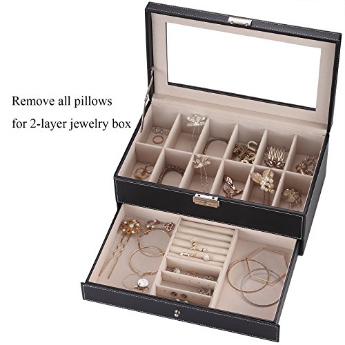 - WATCH & JEWELRY CASE: Two layers, the first layer is 12 watch slots with removable pillows, the second layer is a jewelry tray with 1 ring case,2 earring cards and 2 large compartments. Suitable for storing watches, glasses, earrings, bracelets, rings, ear studs and other jewelry.