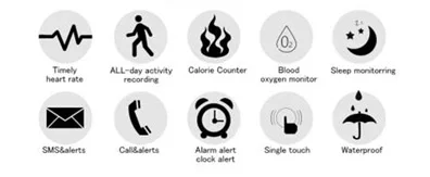 Function:Passometer,Sleep Tracker,Heart Rate Tracker,Alarm Clock,Message Reminder,Call Reminder