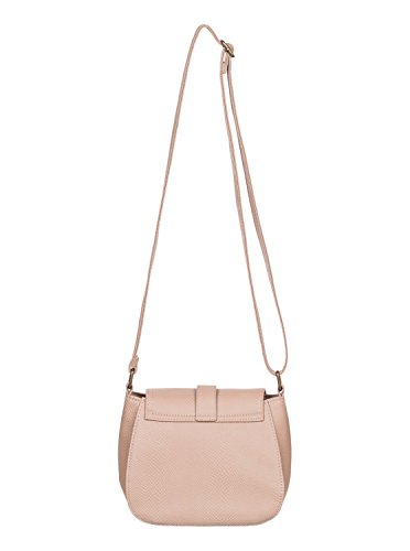 Textured faux leather small cross body bag, magnetic snap closure under front strap, inside zipped pocket, adjustable shoulder strap, and Roxy metal plate.