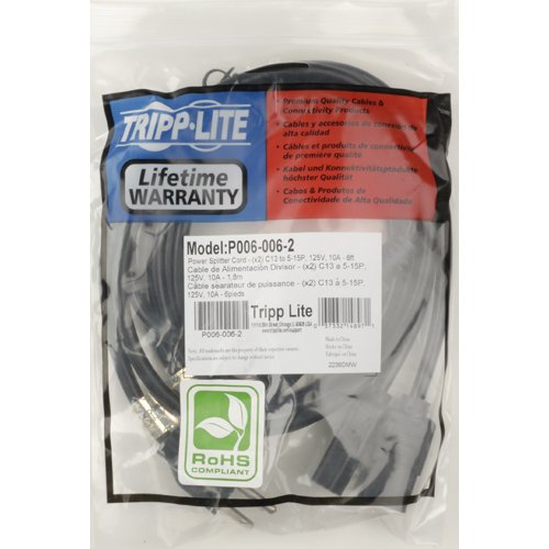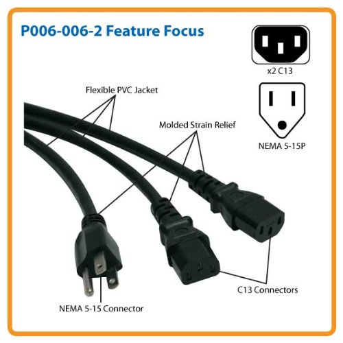 -. Binding : Electronics -. Brand : Tripp Lite -. Color : Black -. EAN : 0704336774160 -. Feature : Power two computers or other device from one outlet / UL and cUL listed / Plug type - NEMA 5-15P (AC) to 2 x IEC-320-C13 (Device) / 18AWG SJT, 10 amps, 125 Volts / 6ft overall length - 47 from 5-15P to split, 22 from split to C13's -. Format : CD-ROM -. HardwarePlatform : Pc -. IsAutographed : 0 -. IsMemorabilia : 0 -. Label : Tripp Lite -. Manufacturer : Tripp Lite -. Model : P006-006-2 -. MPN : P006-006-2 -. NumberOfItems : 1 -. OperatingSystem : Windows -. PackageQuantity : 1 -. PartNumber : P006-006-2 -. Platform : Windows -. ProductGroup : Speakers -. ProductTypeName : CABLE_OR_ADAPTER -. Publisher : Tripp Lite -. Studio : Tripp Lite -. Title : Tripp Lite Standard Power Cord Y Splitter Cable (NEMA 5-15P to 2x IEC-320-C13) 6-ft.(P006-006-2) -. UPC : 163120887774