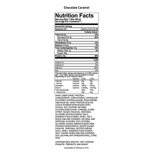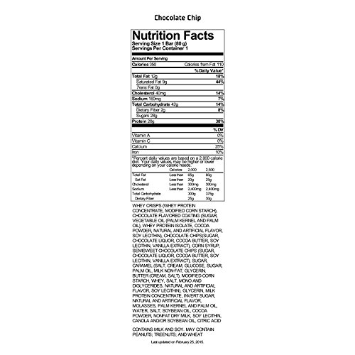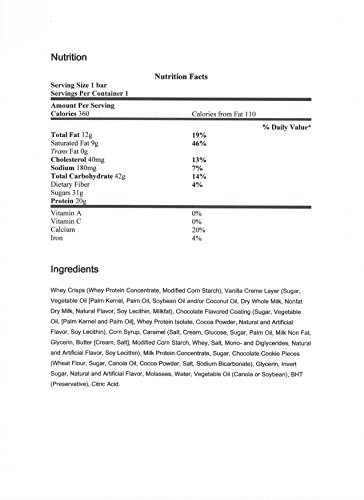 Product Description G® Gatorade Recover® Whey Protein Bar Cookies and Creme, Chocolate Caramel, and Chocolate Chip. 20g protein. Artificially flavored. 360 calories per bar. 0
