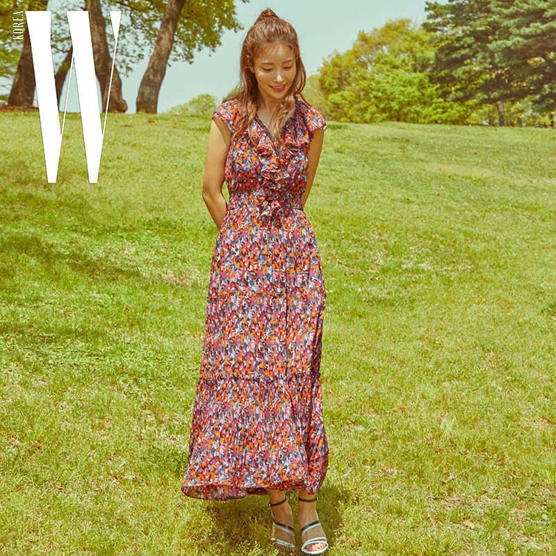 V넥 디자인의 플라운스 장식으로 여성스러운 외관을 보여주며 허릿단의 밴딩을 더해 편안한 착용감을 주는 롱한 기장감의 민소매 원피스입니다.