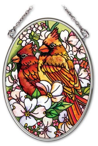Amia 3-1/4 by 4-1/4-Inch Oval Hand-Painted Glass Suncatcher, Cardinals and Dogwood, Small