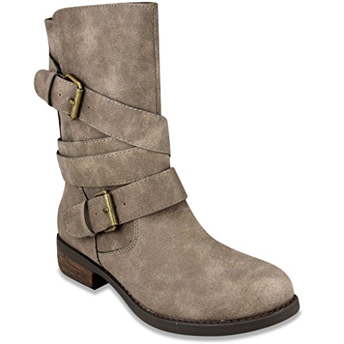 -. Feature : Faux-leather pull-on moto boot with multiple straps and buckles / Stacked heel / Lightly padded footbed