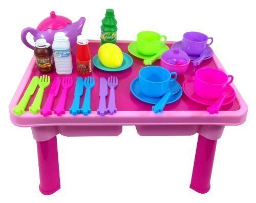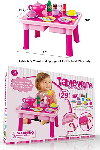 WHAT'S INSIDE: This play set features a Table, Play Food, Toy Tea Set, Toy Dishes, and Bright Cuttable Play Fruits! Table measures 9.8 inches high, perfect to pretend play with toy food and dishes. Not the height for use as a real kids table with a chair.