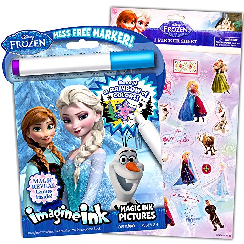 Disney Frozen Imagine Ink mess-free picture book set featuring Elsa and Anna from Frozen! Includes a pack of Disney Frozen stickers. The Imagine Ink and stickers set features Disney Frozen characters in a 24-page picture book, plus 1 mess-free Imagine Ink Marker. The Disney Frozen Imagine Ink picture book uses a mess free marker to reveal a rainbow of colors as you draw on the page. Designed to be used with the included Magic Ink Marker, a clear marker that will not visibly mark most other items. Great fun for any little Disney Frozen fan! Perfect as Disney Frozen party supplies and party favors. Cover art may vary.Feature