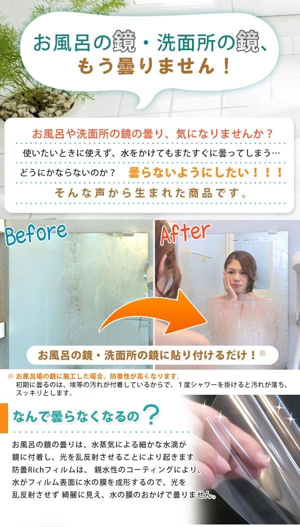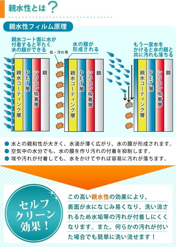 | ガラスや浴室の鏡のセルフクリーン効果を発揮!!曇らず快適な視野を確保します。親水性フィルムにより、光の乱反射を防ぎ、また汚れや埃の付着を抑制しますので、鏡が曇りません。シリコン自己吸着性フィルムの為、失敗しても貼り直しが可能です。 |