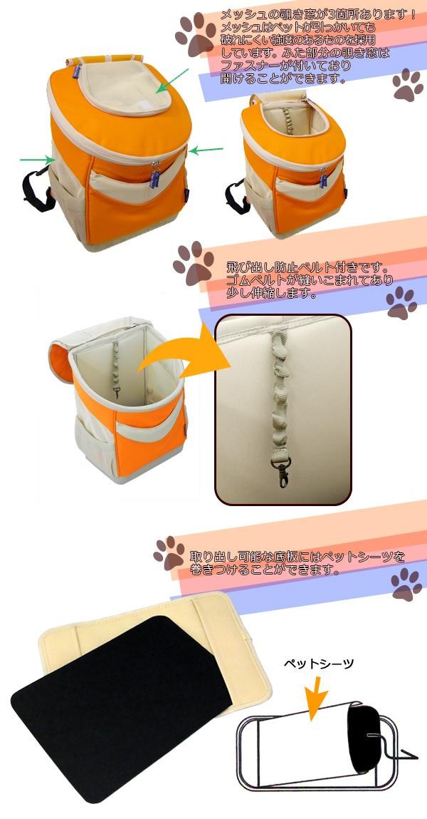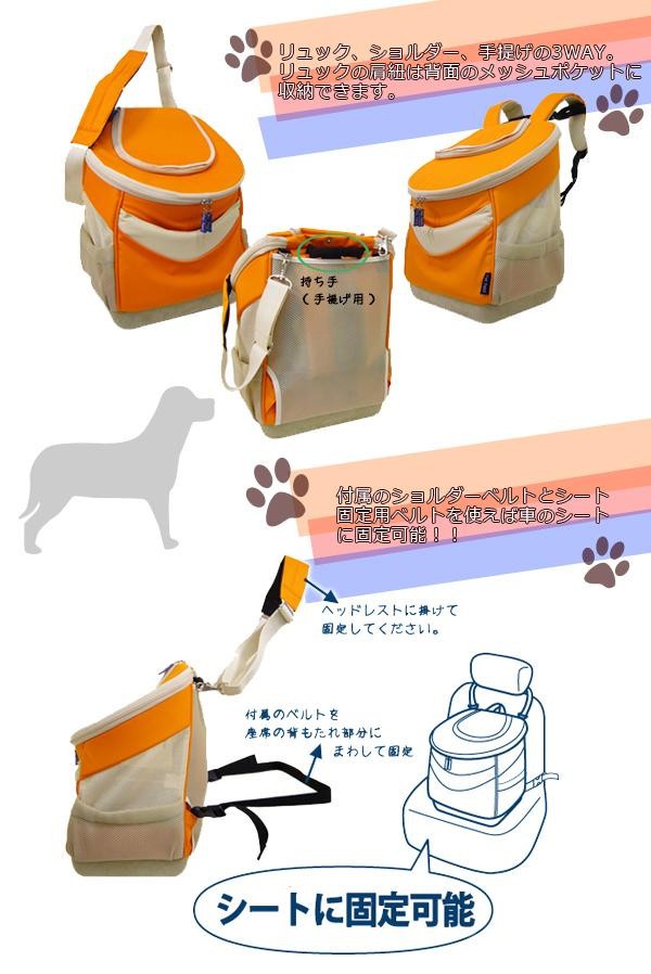 リュック、ショルダー、手提げの3通りの使い方ができるペット用キャリーバッグです。付属のベルトを使えば、車のシートに固定ができるので車でのお出かけにもお使いいただけます♪ふたとサイドにメッシュの覗き窓があり、中の様子が見られて安心。通気性も抜群です!!バッグ内には飛び出し防止ベルト付き。底板は取り外し可能なので、ペットシーツを巻きつけることができます。 |
