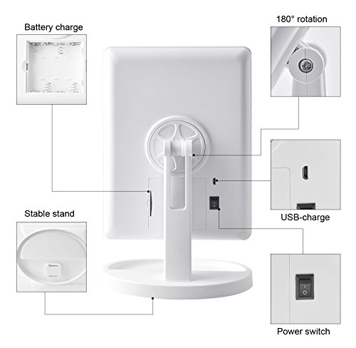 - 16PCS LED LIGHTS: Big square mirror face with bright and durable LED bead lights, can make it convenient for you to doing make up no matter at day or night,dark or poorly lit areas. 16 LEDs around the rim of the mirror give you bright, even, diffused illumination, so no part of your face is in shadow.